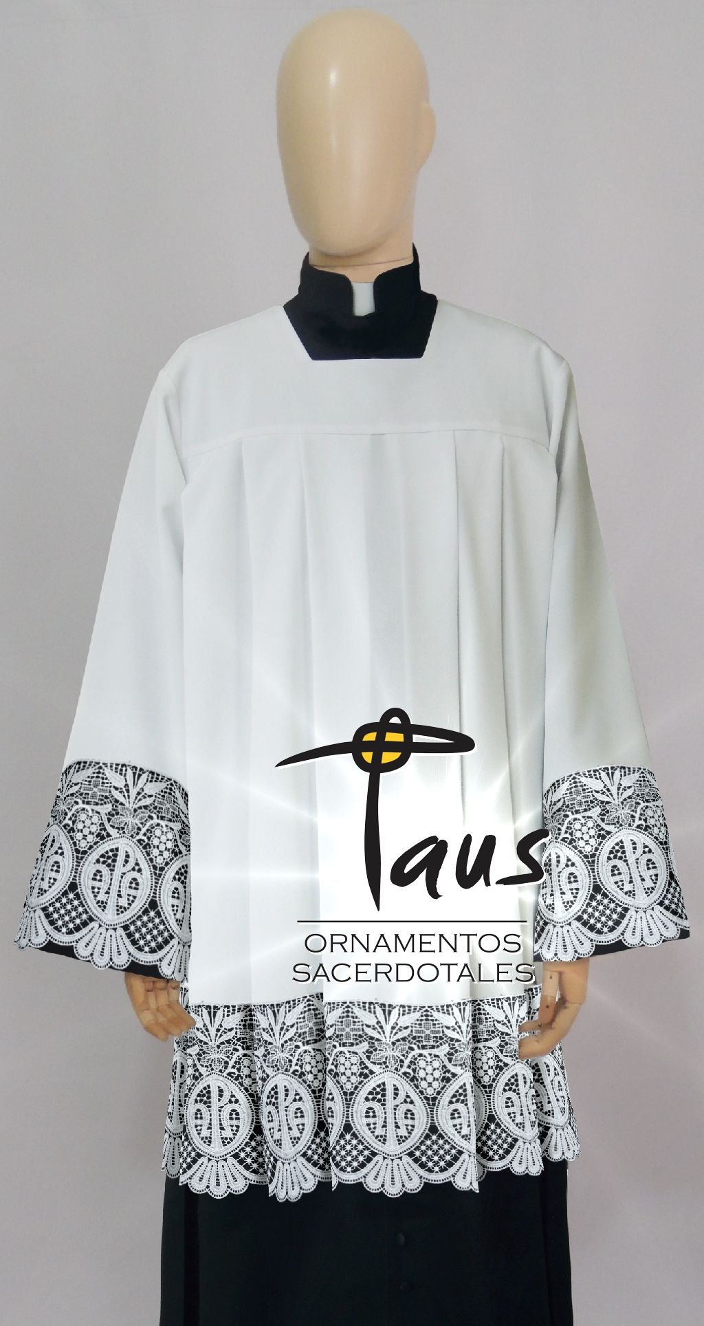Roquete en tela de lino importada con encajes de motivos litúrgicos en mangas y ruedo, con 1 tabla central y 2 laterales en frente y espalda. Medida del encaje: 24 centímetros.