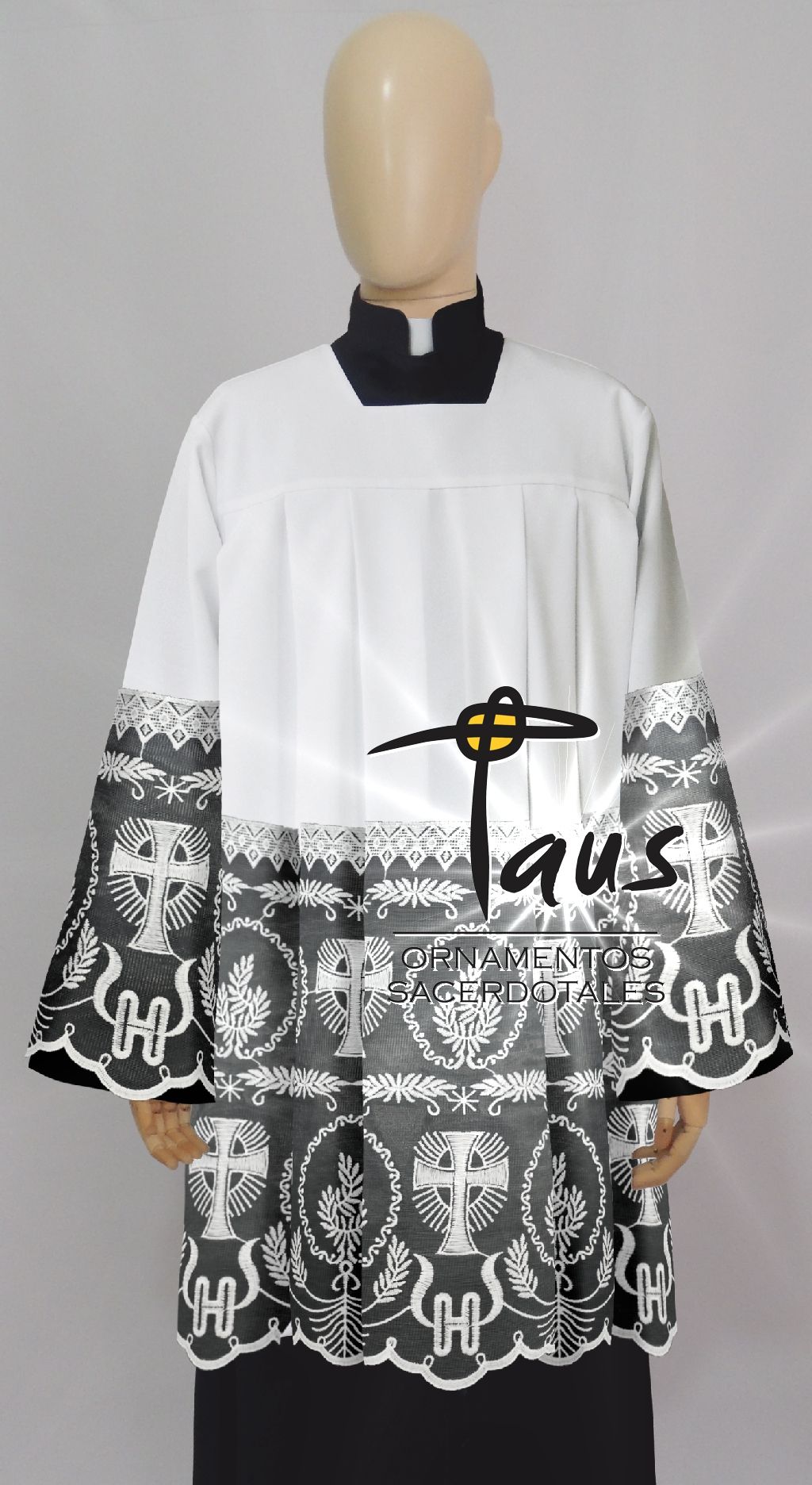 Roquete en tela de lino importada con encajes de motivos litúrgicos en mangas y ruedo, con 1 tabla central y 2 laterales en frente y espalda. Medida del encaje: 50 centímetros.