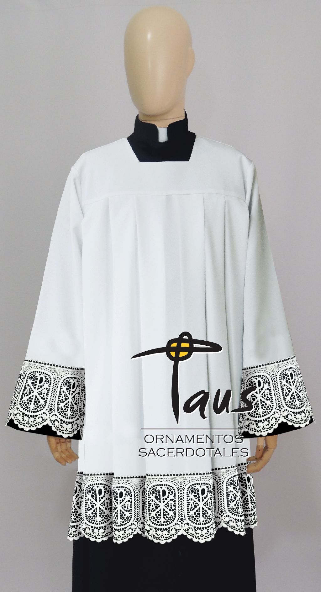 Roquete en tela de lino importada con encajes de motivos litúrgicos en mangas y ruedo, con 1 tabla central y 2 laterales en frente y espalda. Medida del encaje: 14 centímetros.