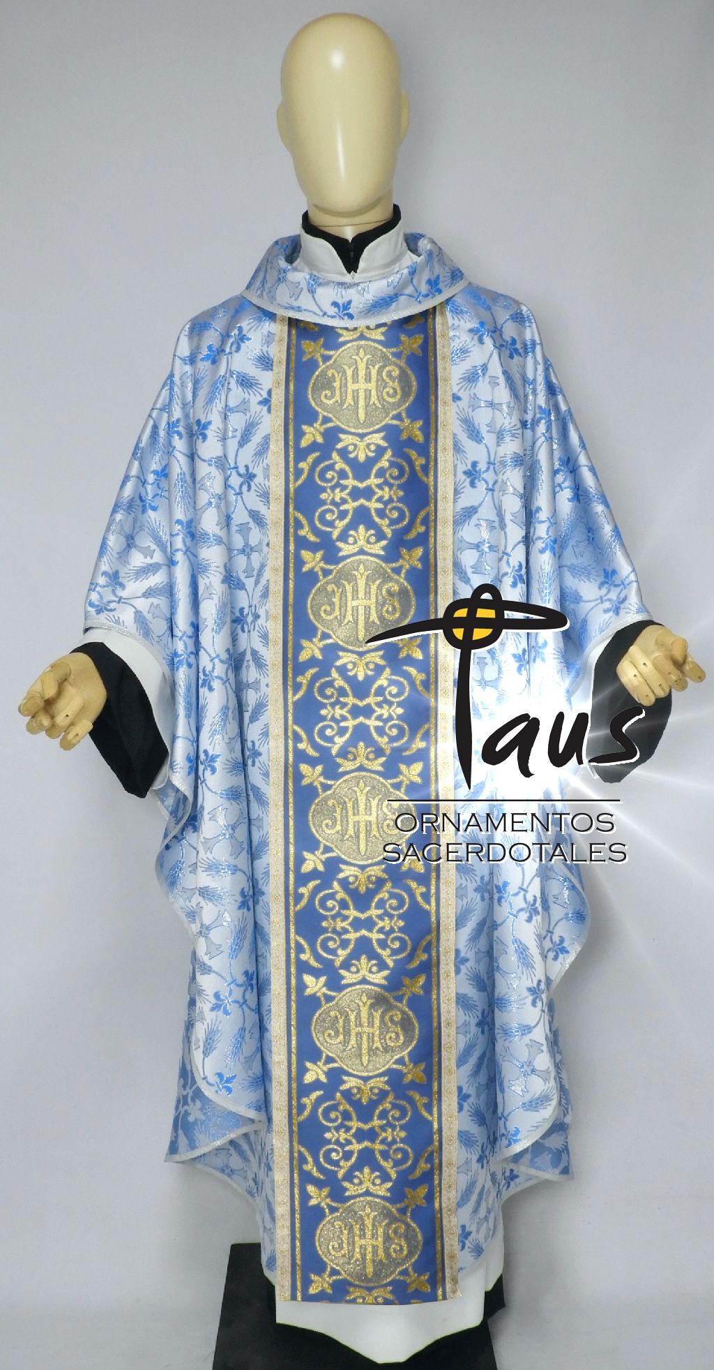 • Casulla en tela brocada importada azul celeste con galón importado.